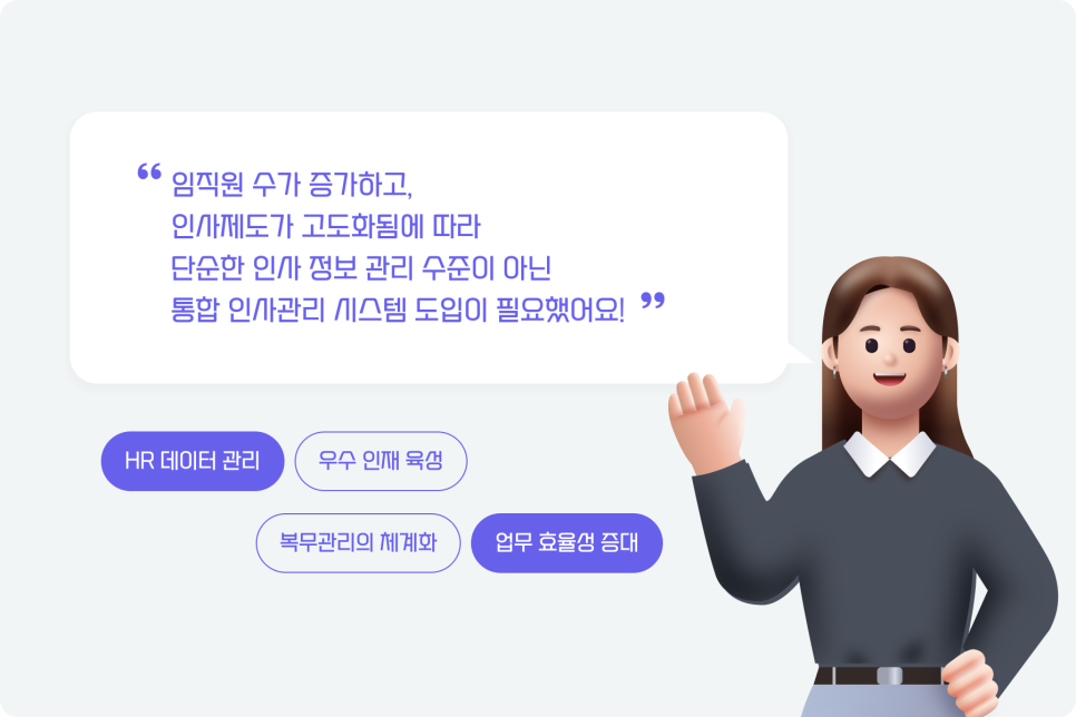 임직원 수가 지속적으로 증가하고 인사제도가 고도화됨에 따라 데이터 관리의 전산화, 복무관리의 체계화, 업무의 효율성 증대, 우수인재 확보와 육성을 위한 인재관리 등이 요구되었습니다. 이를 모두 통합 지원할 수 있는 인사정보 시스템의 도입이 필요했고, 그 결과 U.STRA HR 솔루션을 도입하게 되었습니다.