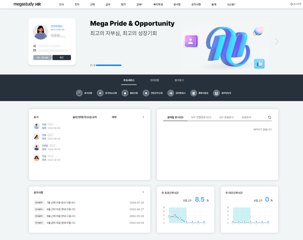 이번 U.STRA HR 도입은, 단순한 시스템 교체를 넘어 메가스터디교육의 HR 업무를 데이터 중심의 체계적인 프로세스로 전환하는 중요한 계기가 되었습니다. 급여부터 평가, 인재관리까지 모든 HR 업무가 하나의 통합된 플랫폼에서 효율적으로 운영되고, 임직원들도 편리하게 사용할 수 있는 환경이 구축되었습니다.
